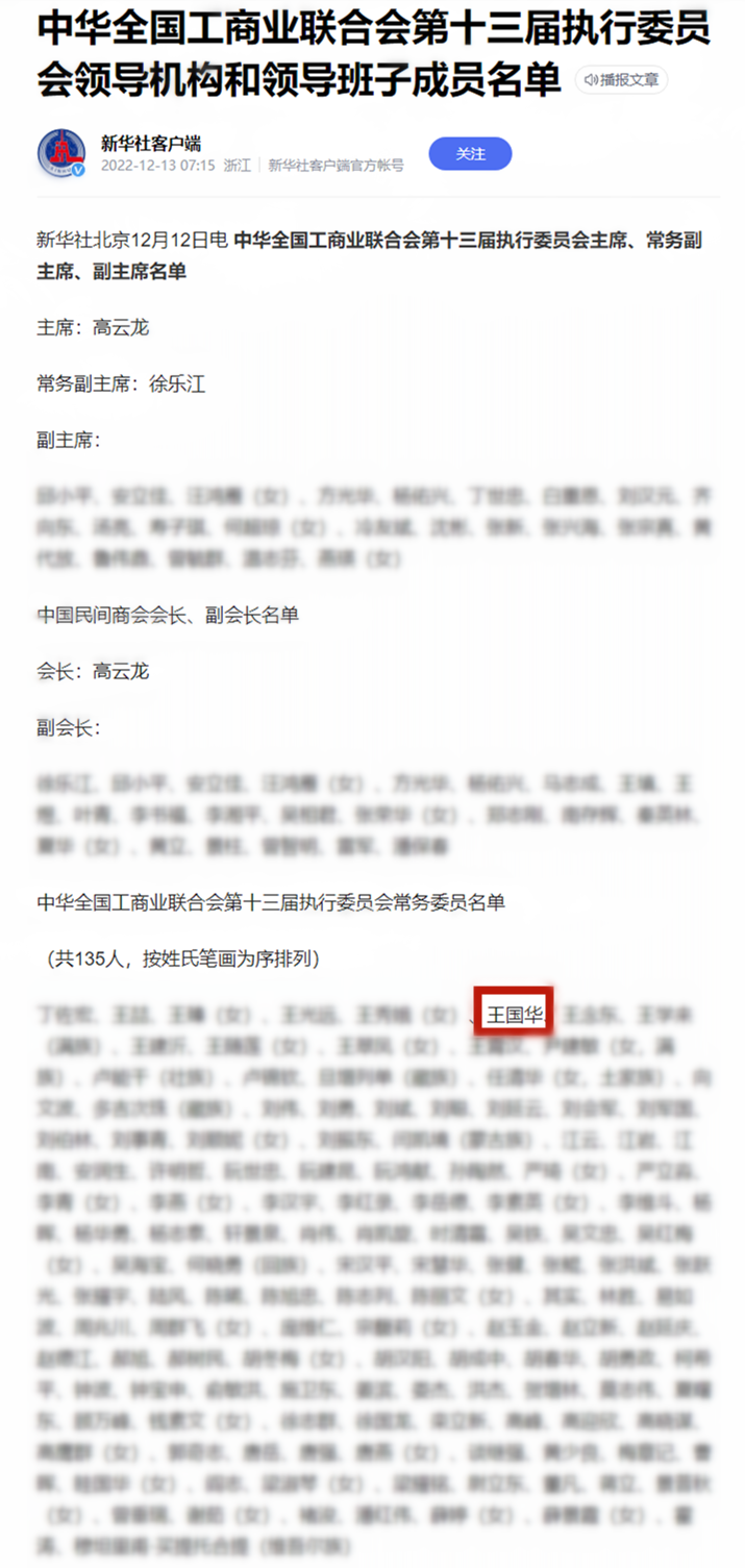 王國華董事長當選全國工商聯第十三屆執行委員會常務委員